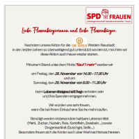 Auch heuer sammeln die SPD Frauen Flossenbürg wieder haltbare Lebensmittel und Drogerieartikel für die Tafel Weiden-Neustadt. Am 28. und 29. November stehen wir vor dem Lebensmittelgeschäft Regn und freuen uns über jede Spende – besonders auch über kleine Aufmerksamkeiten für Kinder zu Weihnachten.